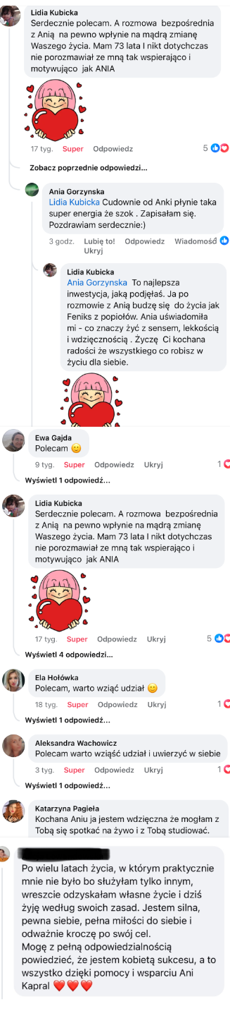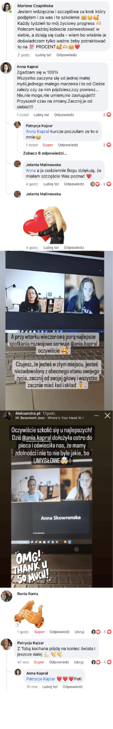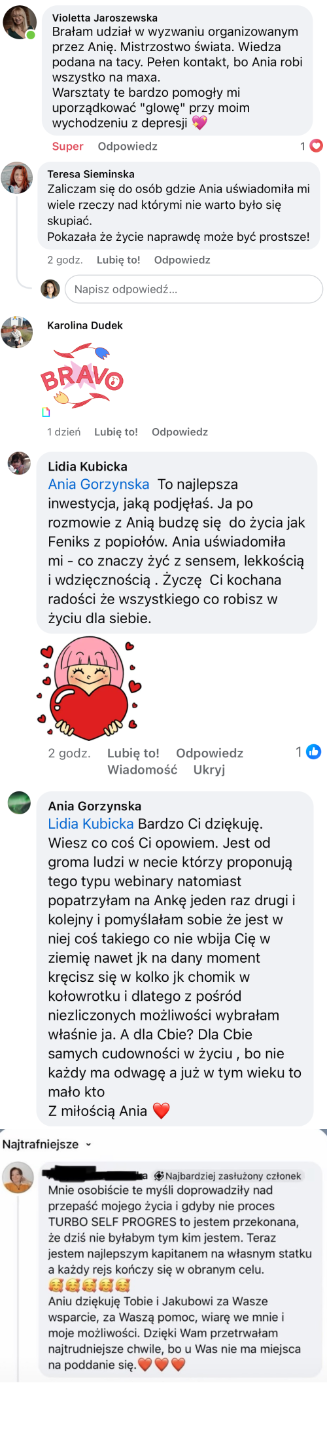 Pomagam kobietom wyjść z trybu przetrwania i wejść w tryb kreacji — zarówno w życiu osobistym, jak i zawodowym. Setki moich studentek przeszło transformację dzięki autorskiemu programowi Turbo Self Progress.